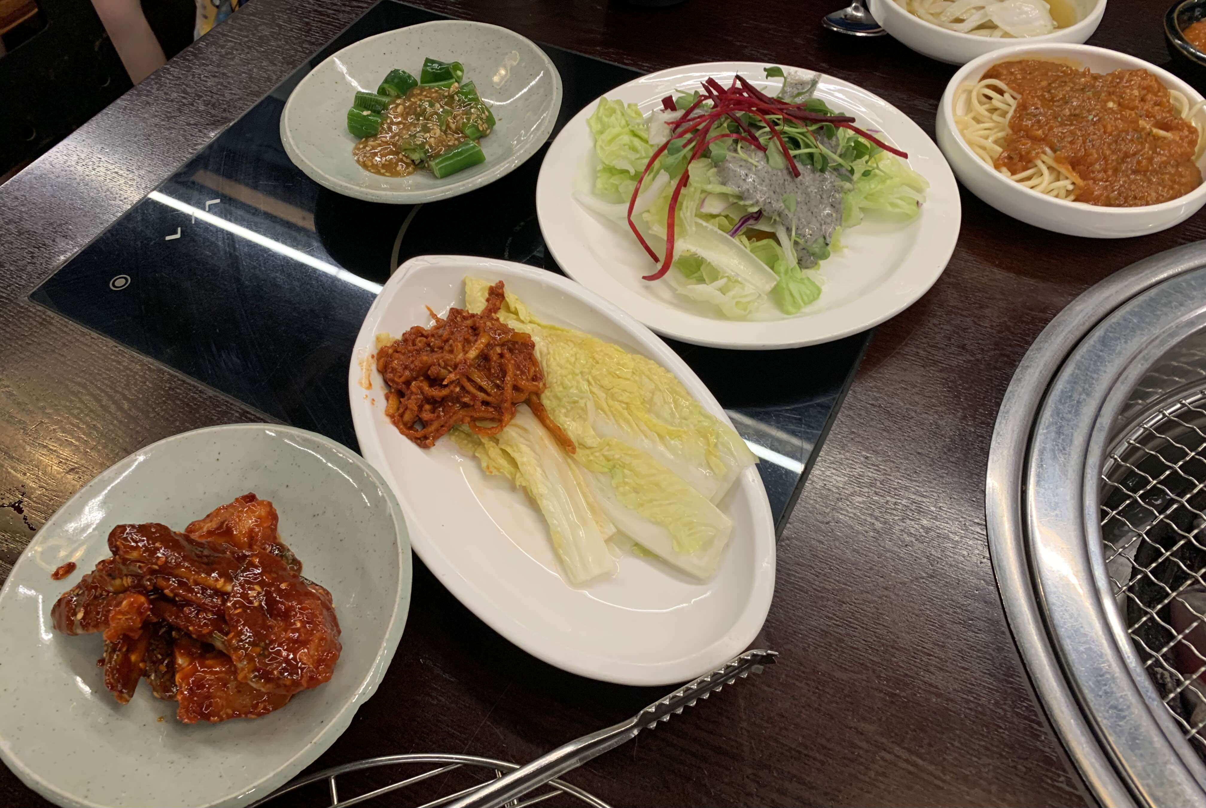 반찬이 정갈하고 세련되게 세팅됩니다. 양념게장, 보쌈 배추, 샐러드, 스파게티가 세팅되며, 쌈채소, 마늘, 쌈장 등 기본 고깃집 세팅도 있습니다. 양념게장은 리필 시 유료지만, 고기와 공깃밥과 잘 어울리는 맛입니다.