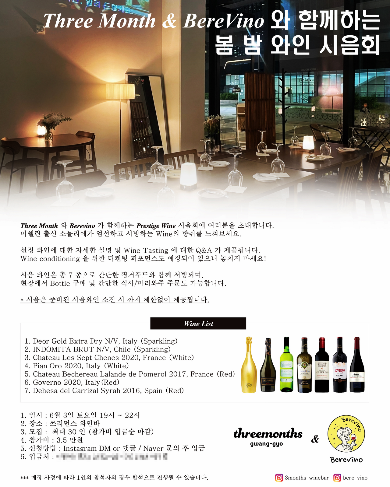 그러다 평소에 자주가던 와인샵인 베레비노에서 광교쪽 와인바와 협업하여 시음회를 연다는 소식을 받았고, 바로 2명을 예약했다.