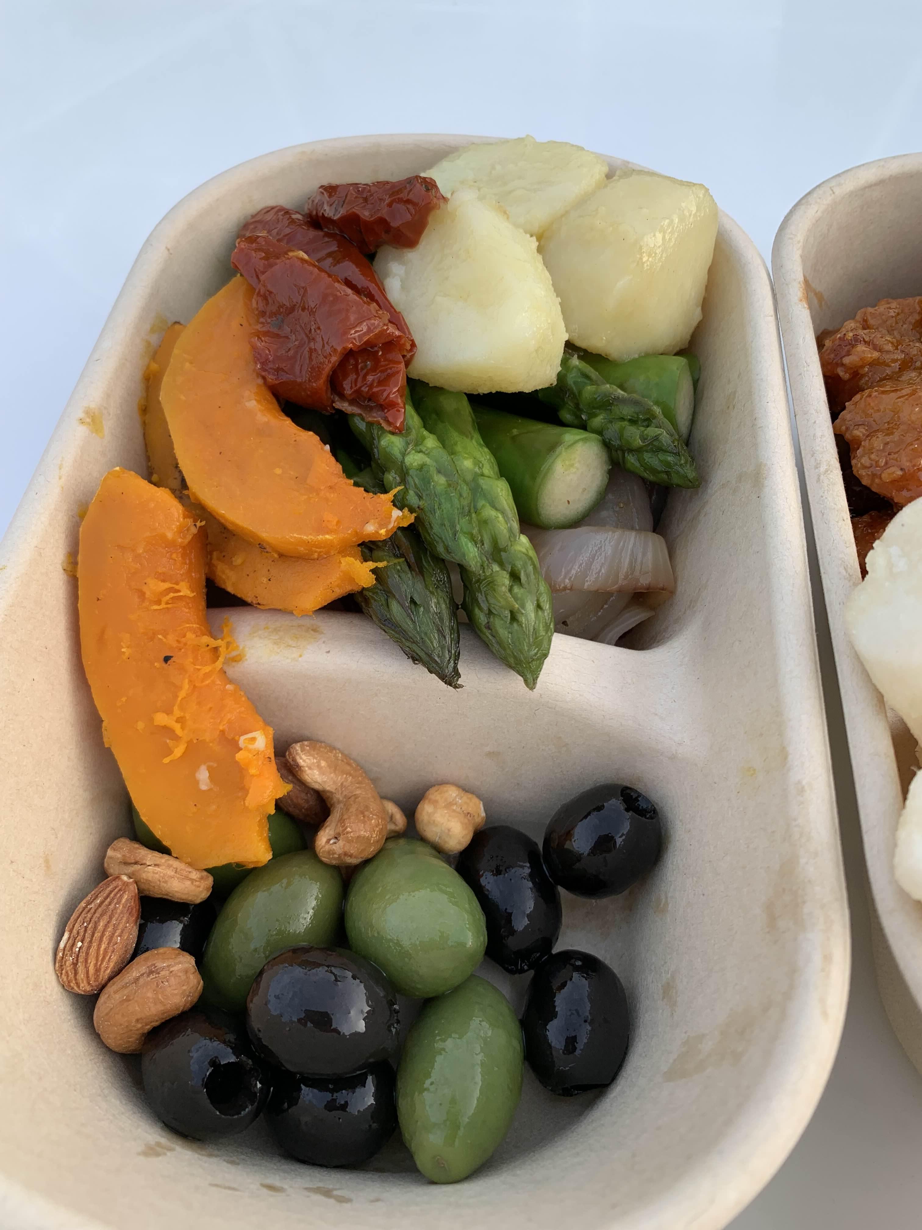찹스테이크, 양념치킨과 떡, 아스파라거스와 올리브, 양파를 포함한 야채가 나옵니다. 작년 후기를 찾아보니 종이 식기에 서빙된 음식이 별로라고 해서 큰 기대를 안 했지만, 종이 식기이긴 해도 생각 이상으로 정갈하고 와인과 어울리는 음식이었습니다.