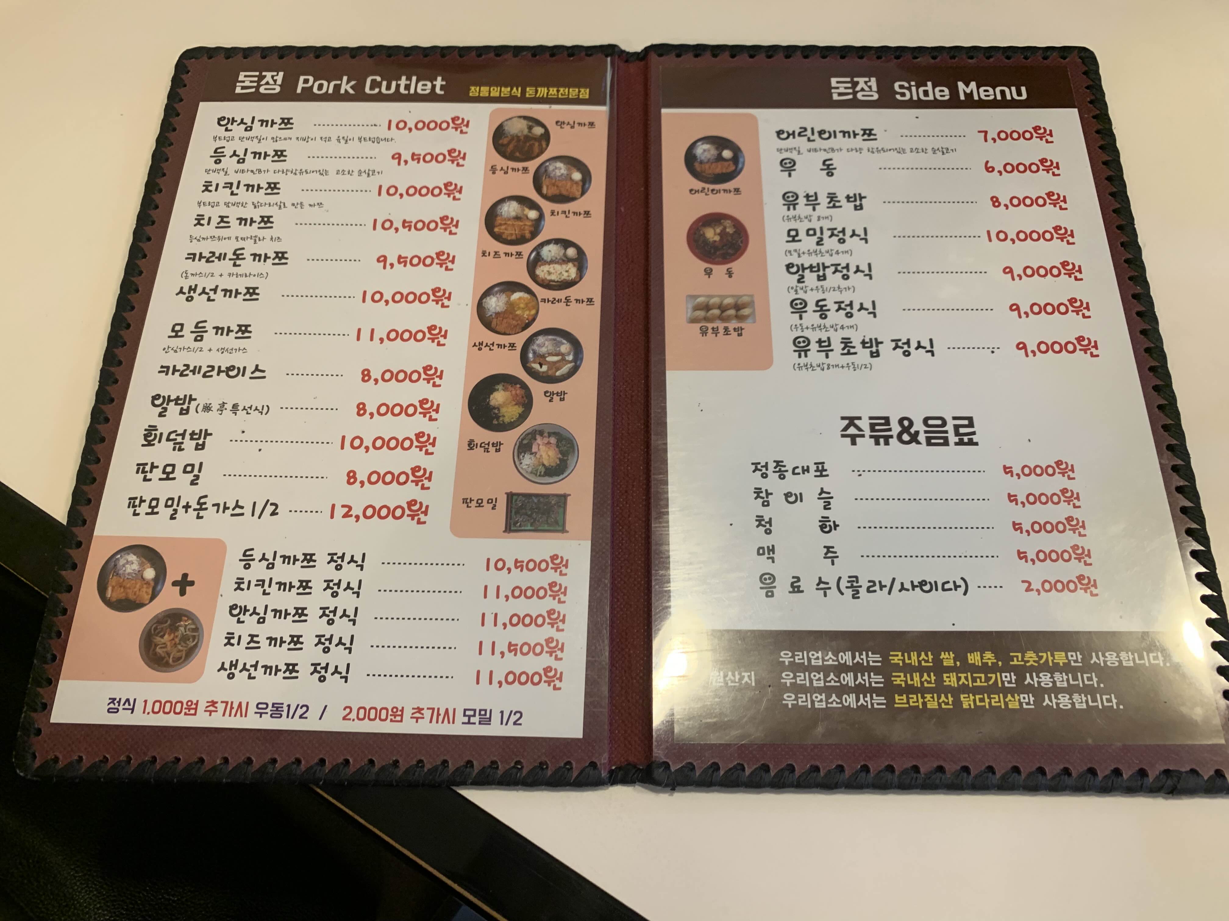 메뉴는 세 가지로 간단한 구성이며, 방문했을 때 특로스카츠는 품절이어서 로스카츠(등심)와 히레카츠(안심)를 주문했습니다.