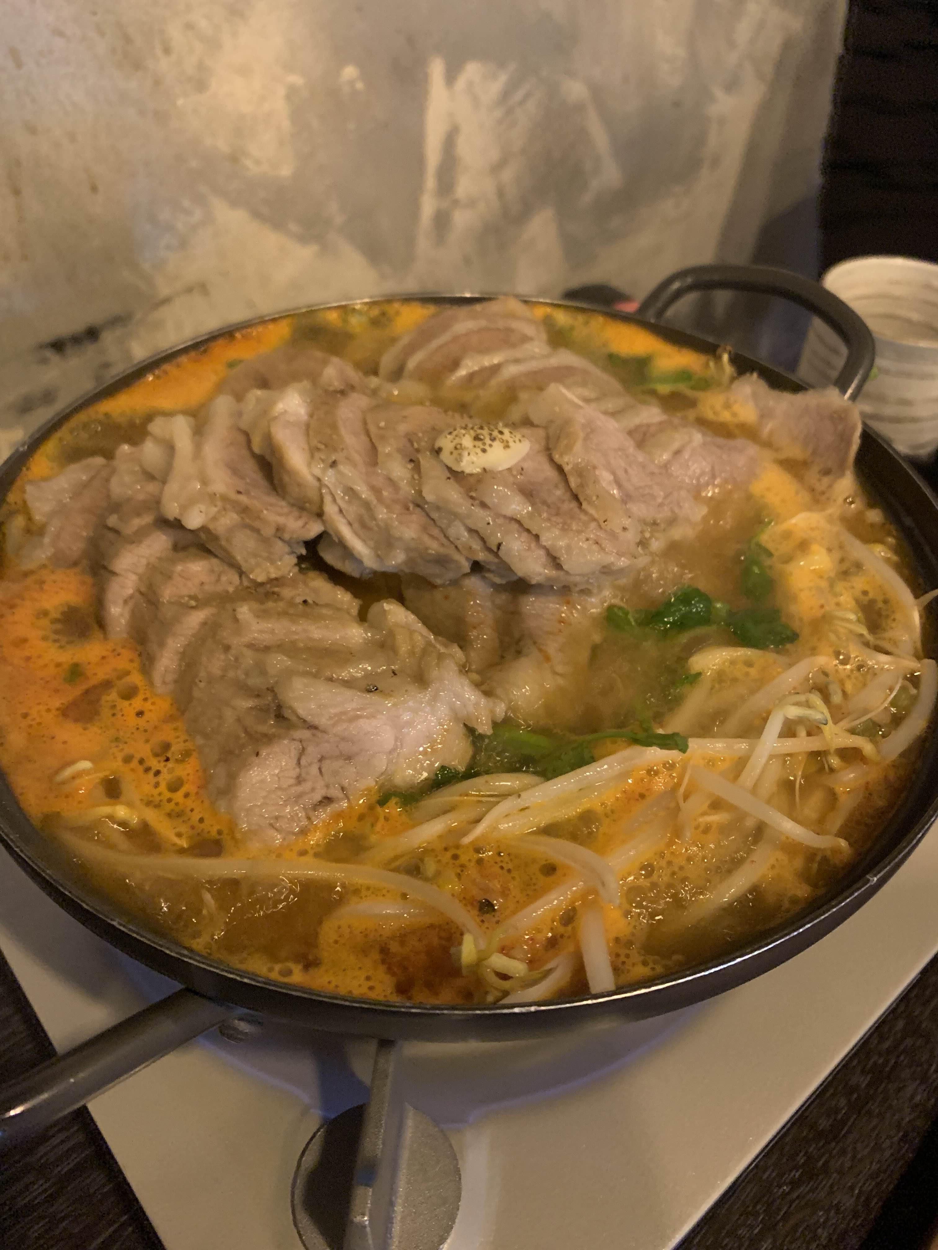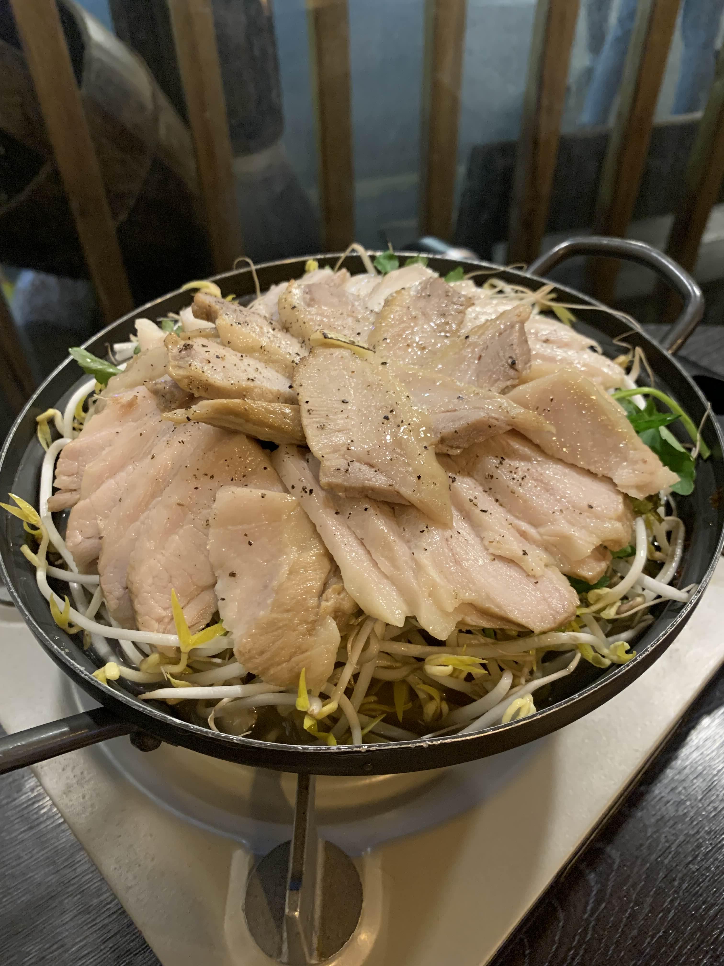 부드러운 돼지 수육과 숙주, 육수로 만드는 전골은 처음에 수육 먼저 먹고 끓으면 국물과 함께 먹습니다.