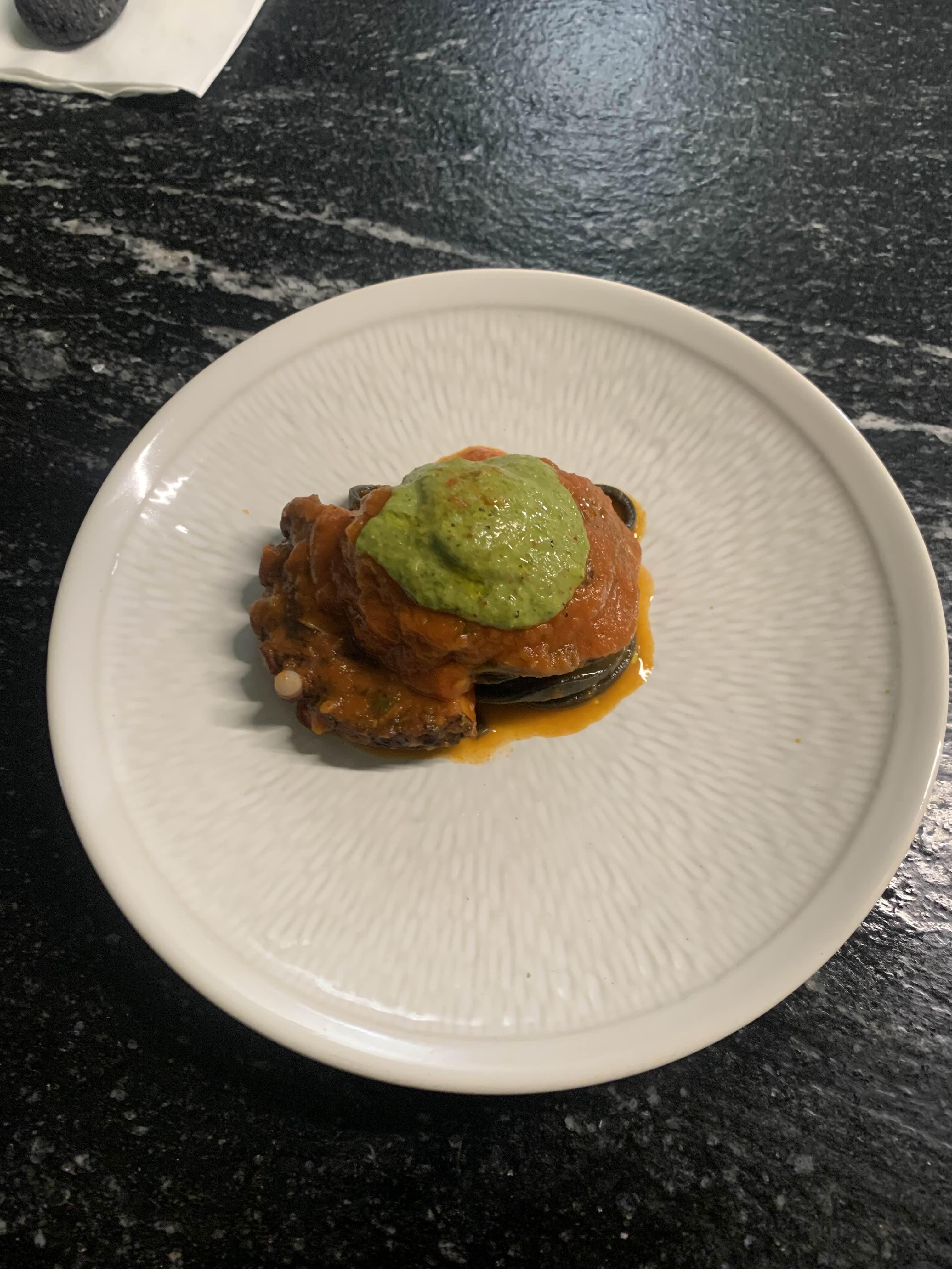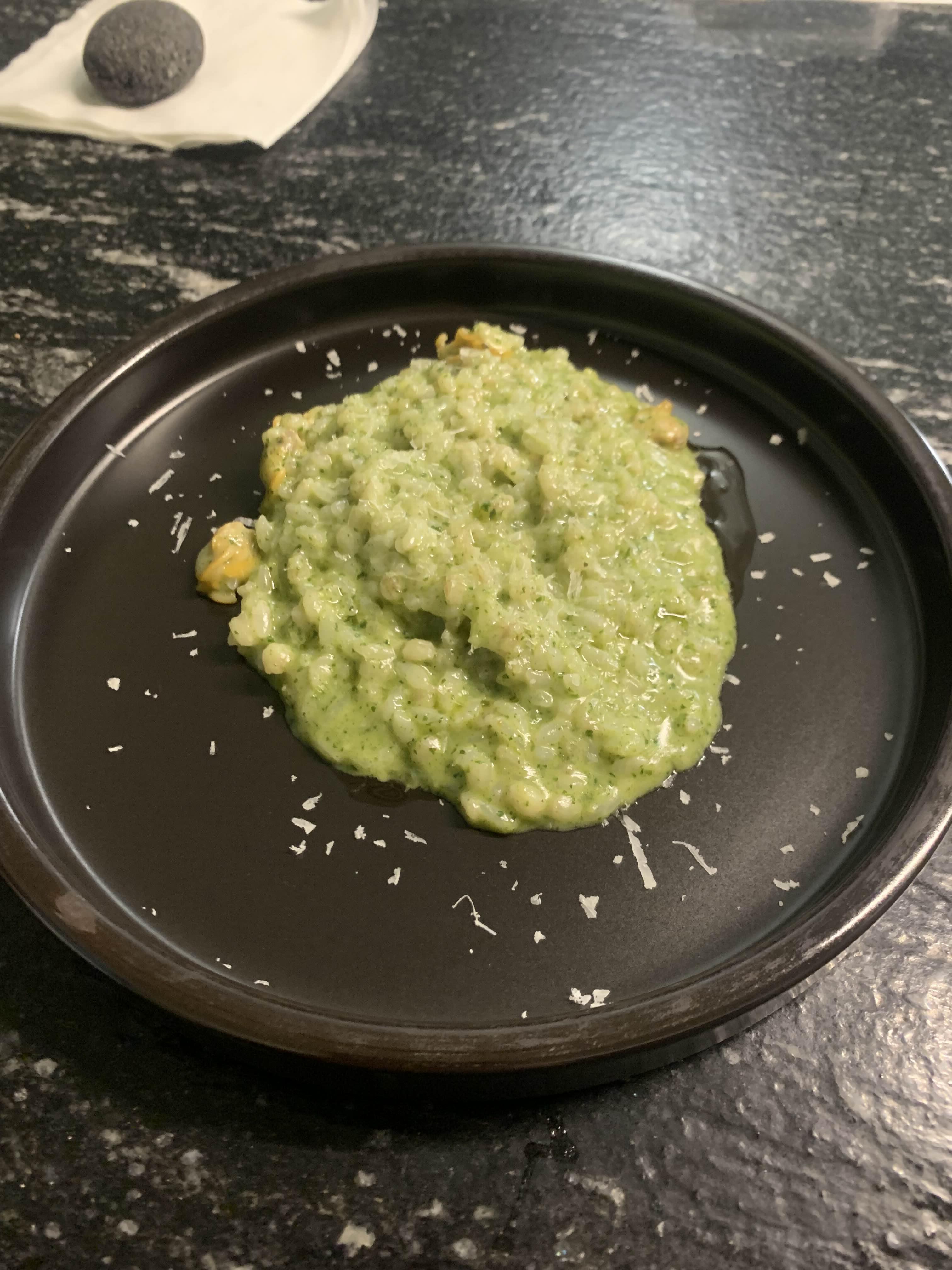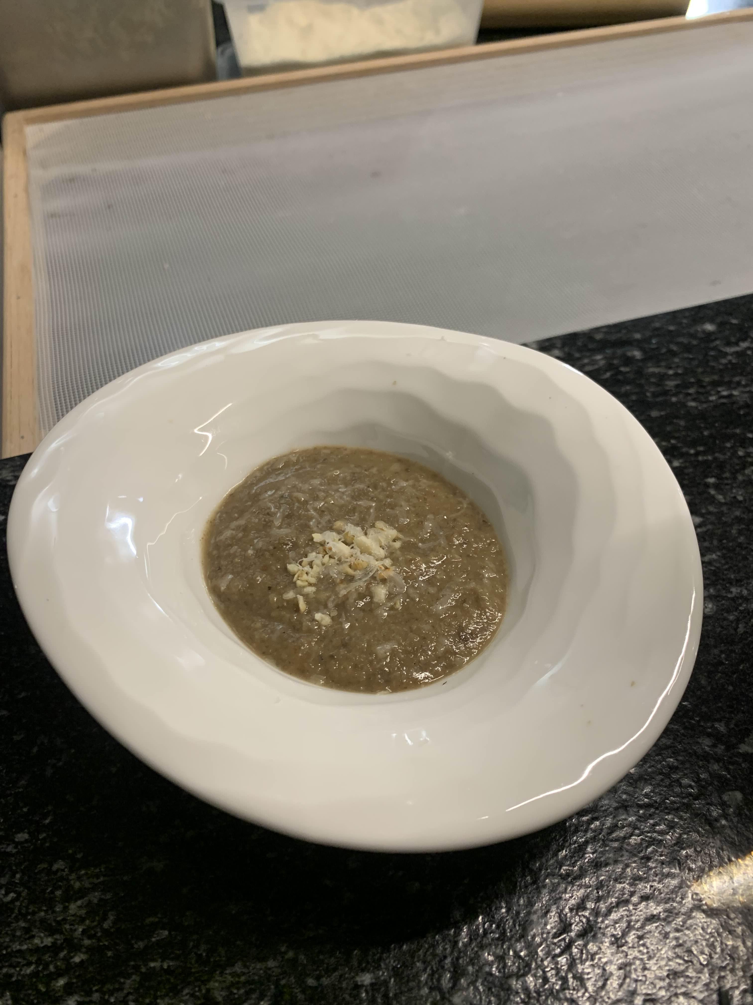 세 번째 요리로 깻잎으로 만든 리조또가 나왔습니다. 깻잎 향이 아주 강해서 호불호가 있을 수 있지만 재료 본연의 맛을 풍부하게 느낄 수 있는 음식이었습니다.