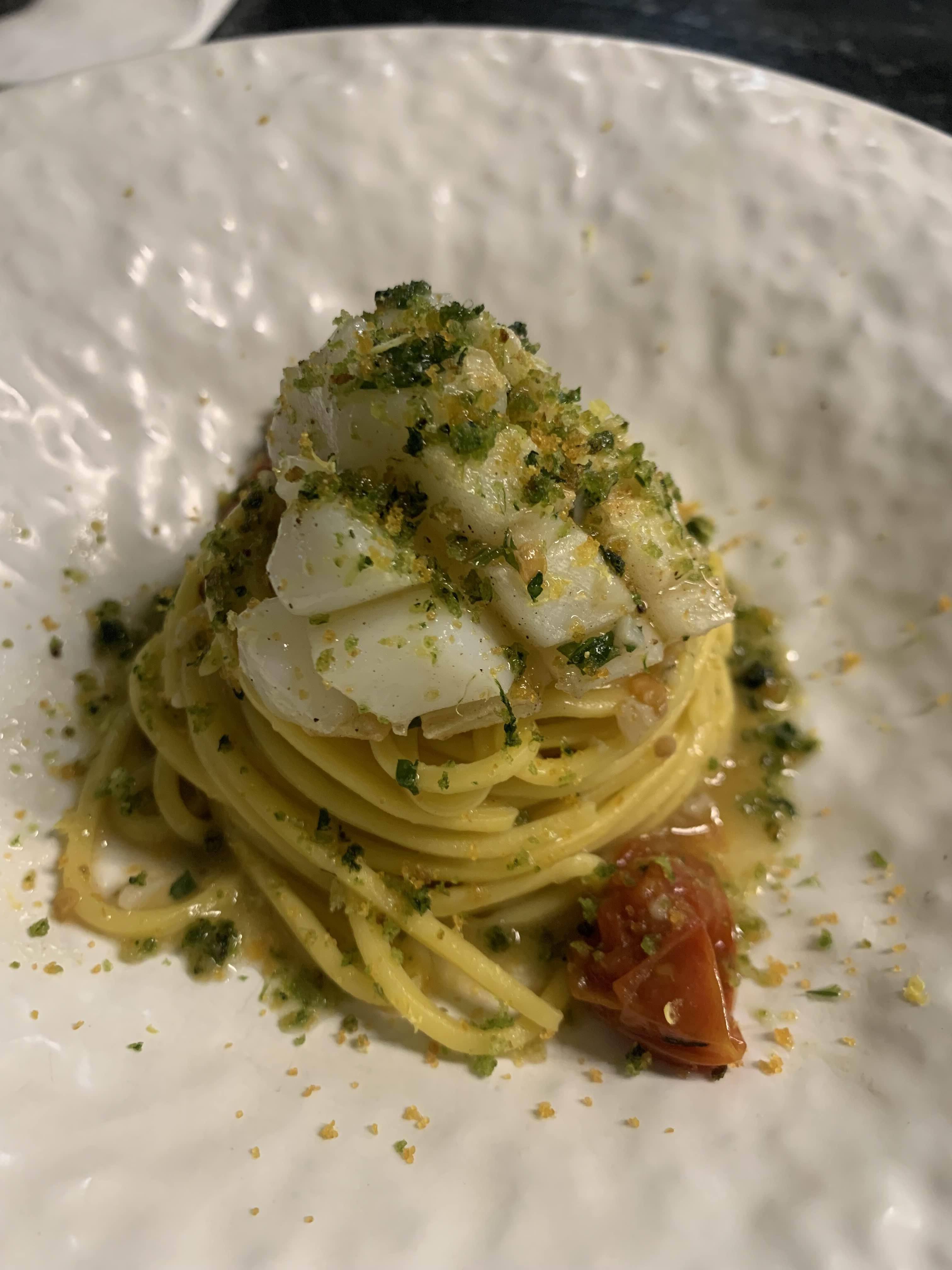 첫 번째 파스타 요리로 오징어가 올라간 알리오올리오 파스타가 나옵니다. 생면을 직접 손님 앞에서 뽑아주어서 보는 재미도 있습니다.