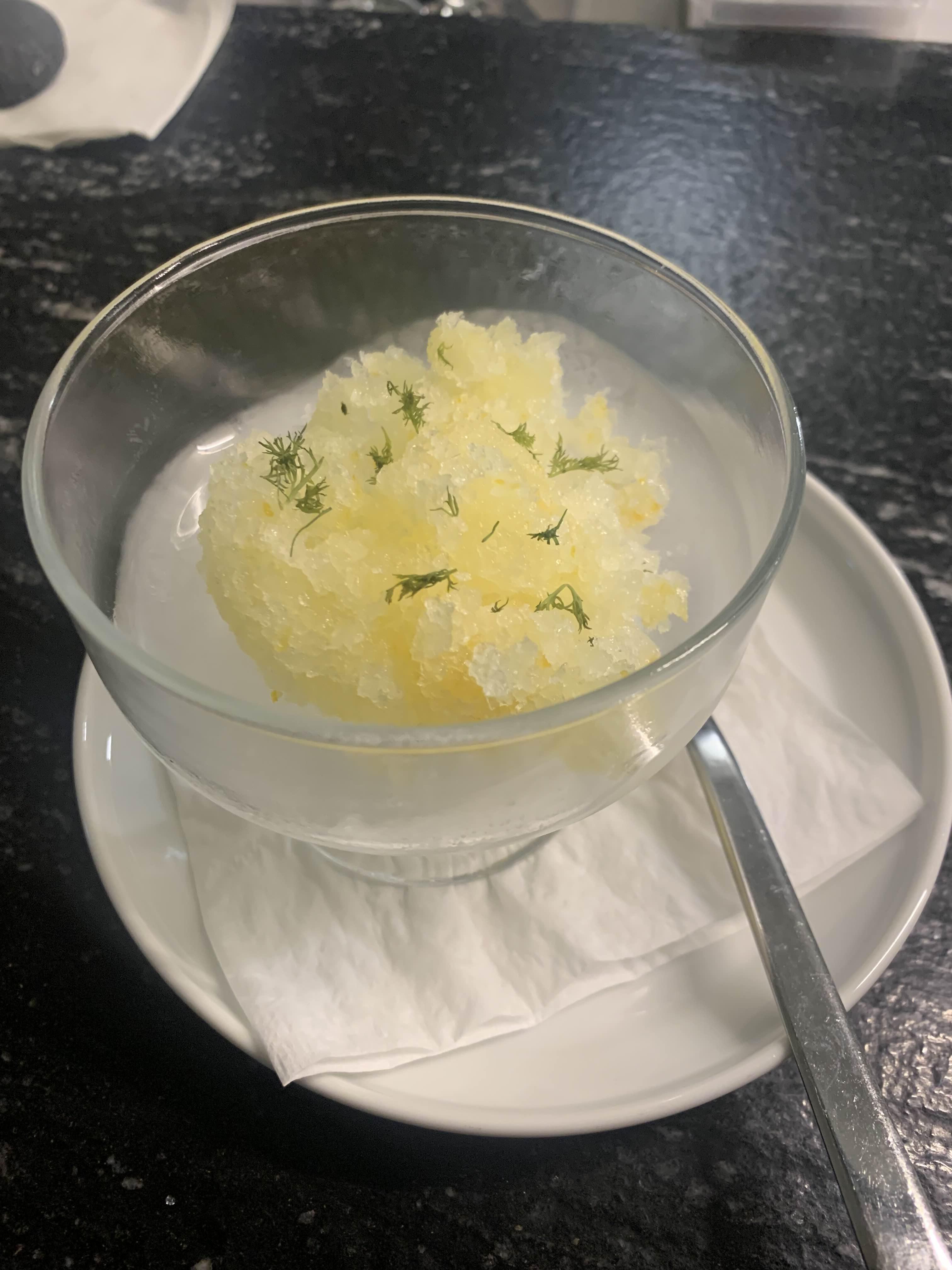 디저트 음식으로 레몬 샤베트가 나왔습니다. 깊고 풍미 있는 파스타를 종류별로 먹다가 달콤하면서도 깔끔한 디저트가 코스 전체 요리에 어울렸습니다.